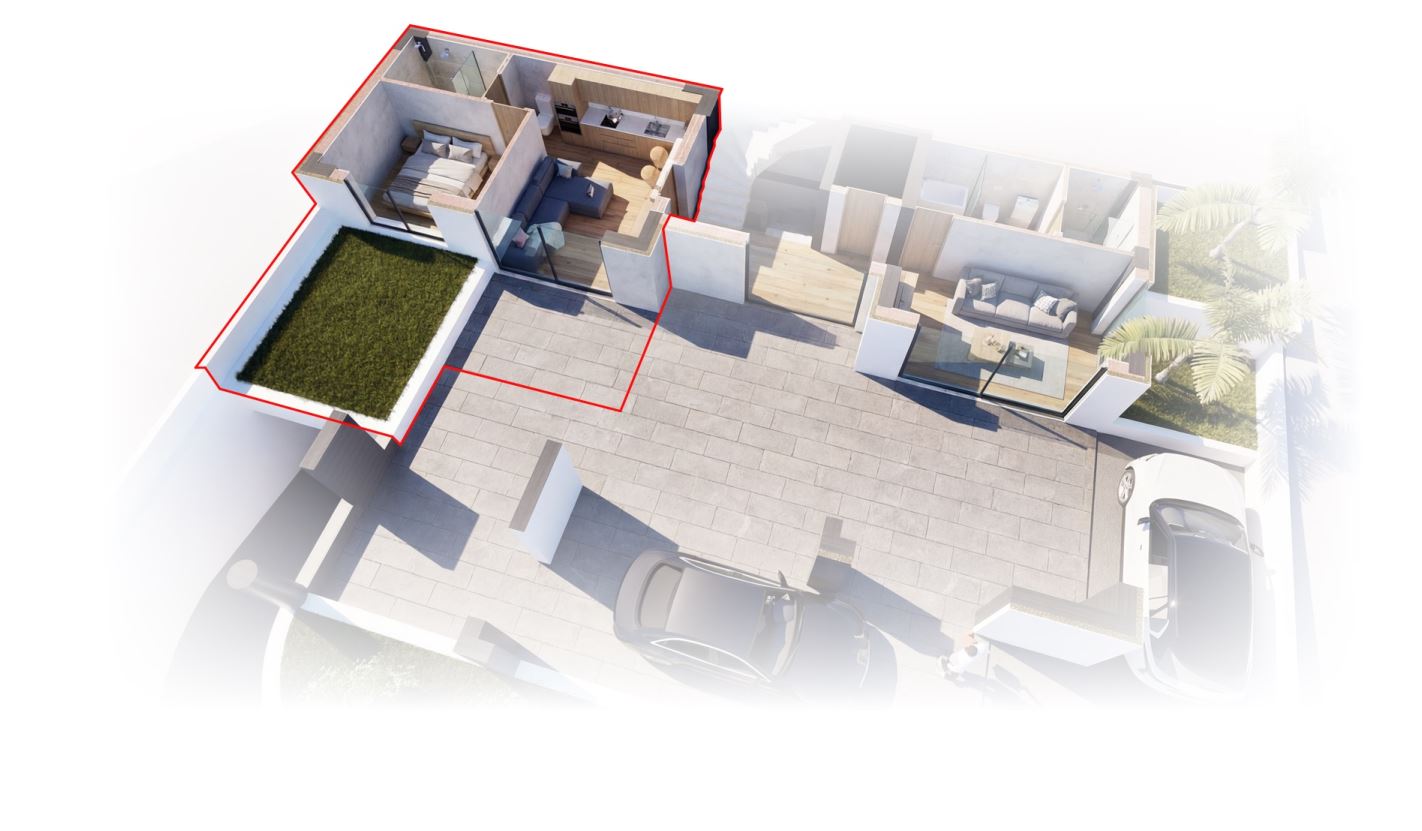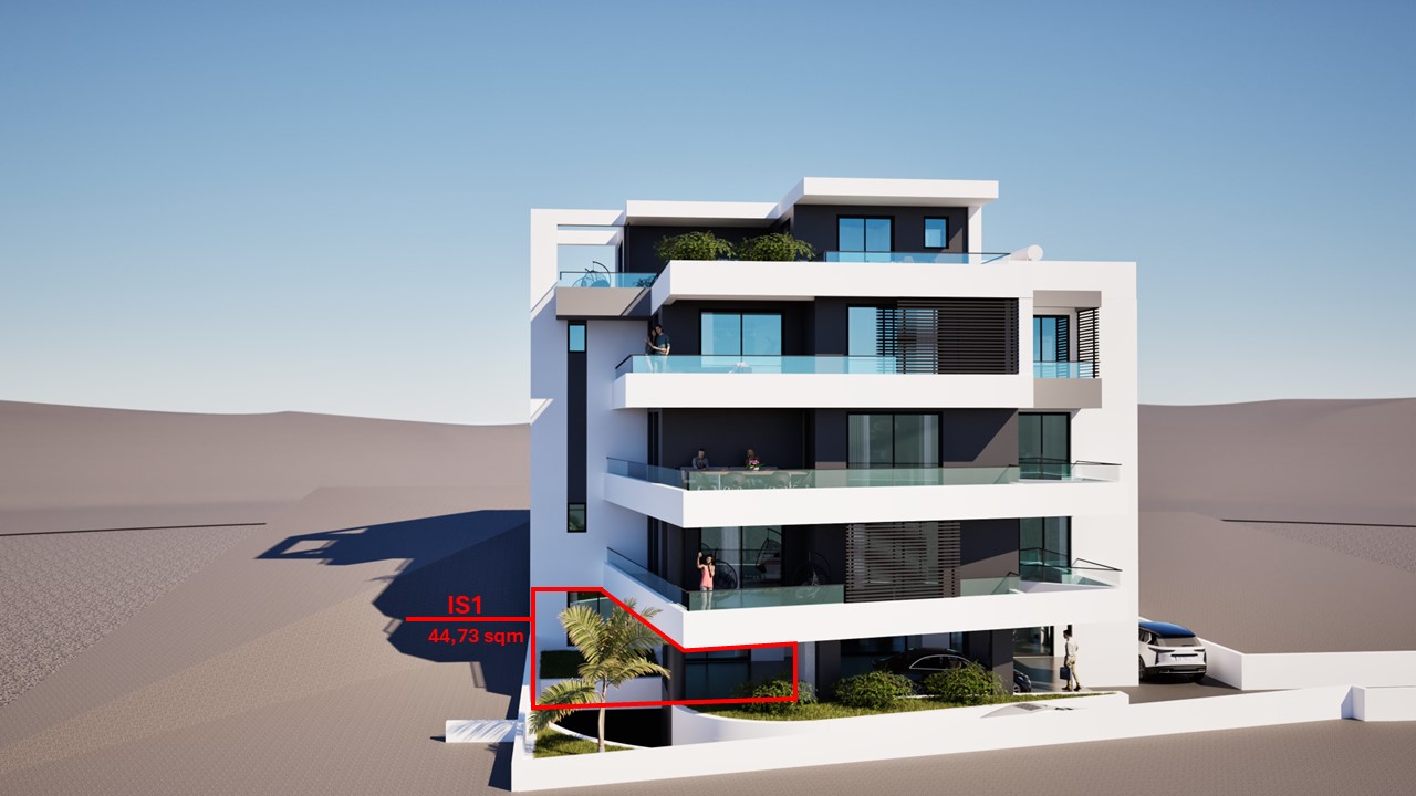 Part of this building, this thoughtfully designed ground-floor residence offers 44.73 sq.m. of functional and elegant living space. Upon entering, you are welcomed by an open-plan living area featuring an L-shaped kitchen seamlessly connected to the bright and airy living room. Large openings lead to a spacious covered balcony, which extends to a private yard — creating a wonderful indoor-outdoor flow ideal for relaxing or entertaining.
