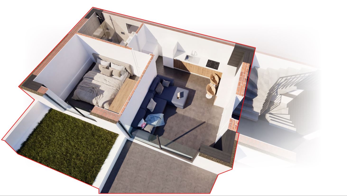 The layout also includes one comfortable bedroom with direct access to the yard, enhancing the sense of privacy and tranquility, as well as a modern bathroom.